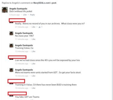 I left this on the facebook page ofAngelo Santopolo, NOT a SEAL,: ” Every lie you tell, every act of posing that you commit, every photo of you having awards not earned, will get you famous. Every comment at the link below will get you a goooogle entry. Why must you stand in the blood of better men than you to claim unearned valor? Wasn’t being on a Sub enough for you?