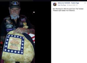 I know (hopefully) that the Souls of Honor folks have been contacted and replied, (see below) I contacted the Wisconsin, 4th HOOAH Veterans Group who gifted him a quilt (tehy also replied, see below) and then I also messaged the quilt making group, Twisted Threads Quilt Group, but I have not received a message back. I sent them the 4th HOOAH Veterans Group photo and TAH link.