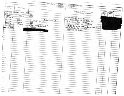 Looking at his 2-1, he couldn’t hack it as a 95 series MP (probably too fat to get in and out of a patrol vehicle) so he tried to go the OJE (On the Job Experience) route to becoming a 76P (Repair Parts Stock and Accounting Clerk/think Shop Stocks) Parts Clerk. Don’t know whether that worked out or not as he was duty MOS re-slotted back to 95 Series MP until discharge.