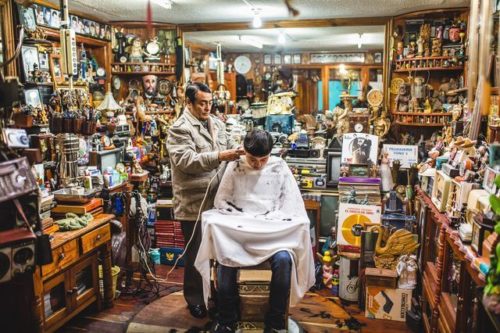 A barber cuts a young man’s hair in his shop in Mexico. He has worked out of the same shop for more than 40 years, collecting interesting and unique items for his collection along the way.