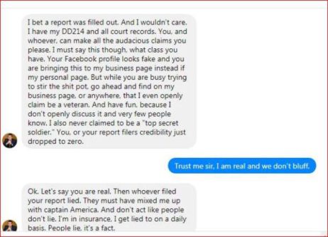 SO wait a second.. He claimed to be in Black Opns in private and then disappears from the Insurance business, on Facebook, when he gets called out. Must be on a Top Secret Mission.. You know, he’s over 6 ft and a heavy 220 lbs. Probably just a BIG BULLY.