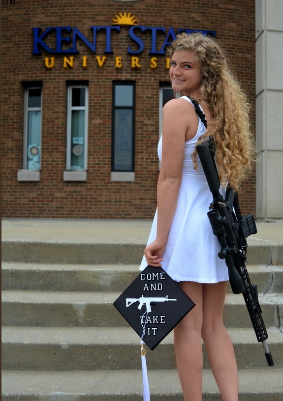 Now that I graduated from @KentState, I can finally arm myself on campus. I should have been able to do so as a student- especially since 4 unarmed students were shot and killed by the government on this campus. #CampusCarryNow pic.twitter.com/a91fQH44cq