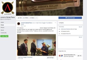 The bottom pic is a screen shot that indicates that Task Force Dagger Foundation presented “former Ranger Earl Phillips” with some token or award, a “Bullet Pen.” I wonder where they got the idea Phillips was a Ranger. The pin was enough. The tee shirt is a bonus. The comment to the “pen” photo seals it.