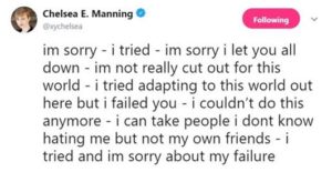 The traitor formerly known as Bradley Manning tweeted out a suicide note last night;