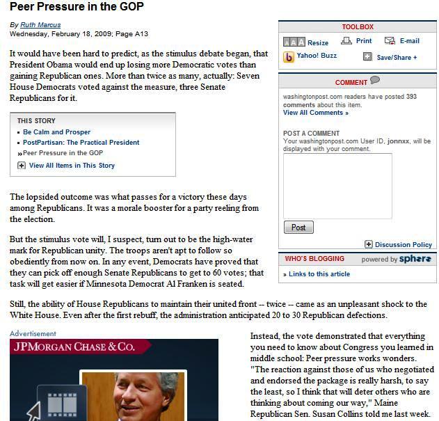 Washington Post‘s Ruth Marcus tries to explain the near victory the Republican Party scored in the recent over the stimulus bill last week by chalking it up to “peer pressure”. To recap, the Republicans attracted six Democrats while losing only three Republicans to the Democrats;