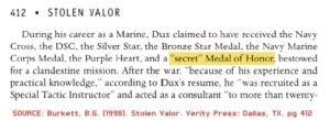 He was also featured on the old POW Network website. But Dux has never conceded defeat, mostly because his wild-ass stories formed the basis for the Van Damme classic movie “Bloodsport” – and you know that Hollywood is never wrong. So last year we took our wacks at him. He claimed to be an elite Force Recon Marine who earned a “secret” Medal of Honor, a Navy Cross, a Distinguished Service Cross (actually an Army award), a Silver Star, a Bronze Star and a Navy and Marine Corps Medal.