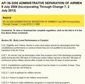 You’ll notice down there in block 25, it says that the separation authority is AFI 36-3208 – an entry level discharge for conduct or performance;