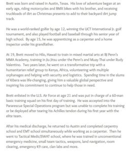 Brett enlisted in the U.S. Air Force at age 21 and was put in charge of a 60-man basic training squad on his first day of training. He was accepted into the Pararescue Special Operations program but was unable to complete his training or be deployed after tearing his Achilles tendon during his first year with the elite team.