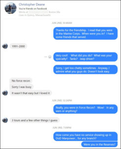 Brett Rudy, if you research Classmates.com, you will see Christopher Deane’s profile listed for St Cloud, Florida High School for the years 1991-1995. In the 1994 profile, he posted a picture that was similiar to a picture in his Facebook account. How could he have been in the USMC if he was in High School in Florida from 1991-1995?