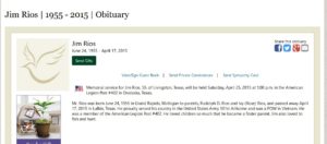 Someone who met this fellow, Clinton James Rios, in 2007, says that he told our tipster that he was a POW in Vietnam as well as a special forces soldier. “I questioned him one time about it, after I asked a few questions, he started avoiding me, and I didn’t see him again until his funeral.” He was reminded of the encounter when Mr Rios passed three years ago and the family posted this obituary;