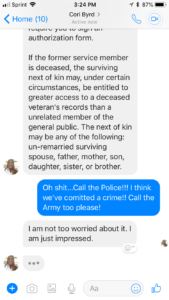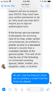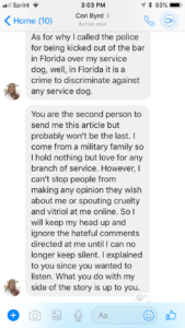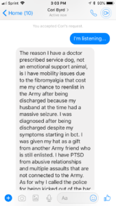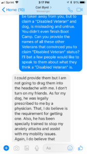 Someone sent us their work on this Cori LeCinda Pierce person, now going by Cori Byrd, who claims that she is a veteran, and of course, for proof, she has a service dog;