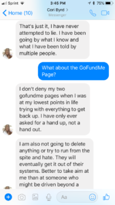 She’s a professional mooch. Run her name in GFM: Cori Byrd. She claimed to have four kids but that her fiance left her holding all the bills. She wanted to “bring my babies home for Christmas.” Some saps came up with $145 for her. Then there’s the GFM b/c she’s such a great writer, vanity publishers contacted her and invited her to be published by them! And, of course, there’s the doggie vest GFM. What a POS. Four kids and regularly hitting a “dive bar” as she called it. Mother of the Year nominee.