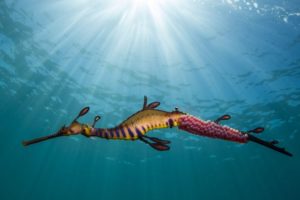 Off the coast of Flinders, Australia, swims a male weedy sea dragon. Like its relative the seahorse, the male sea dragon will care for the eggs laid on his tail by his female mate.