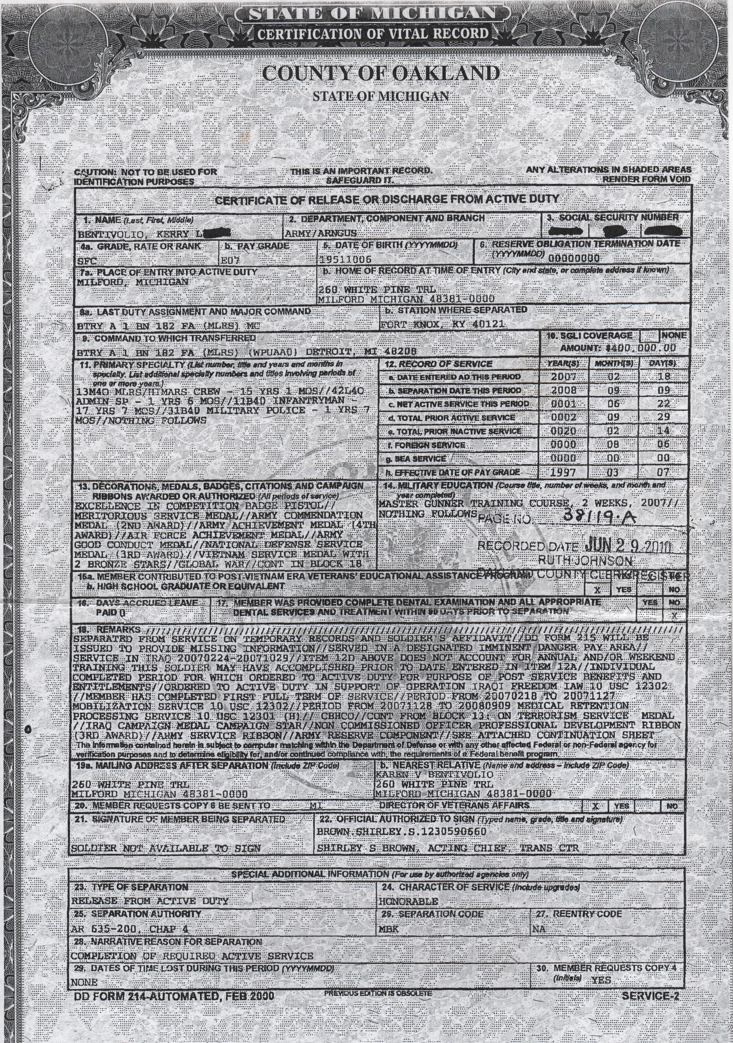 The DD214 above is only his most recent, when he was discharged from a short tour in Iraq on active duty (mobilized under “Title 10” orders) while in the Michigan National Guard.