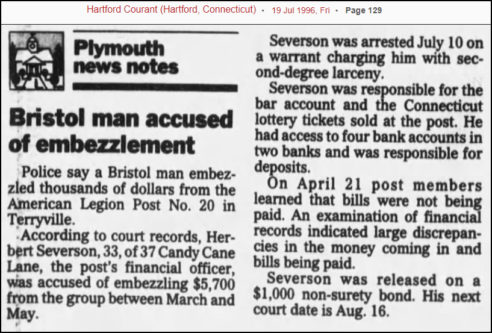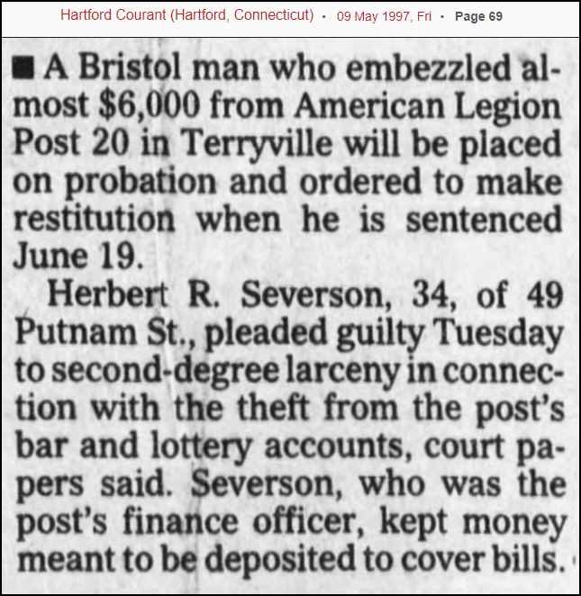 Herb Severson pleaded GUILTY to the embezzlement of close to $6000 from an AL Post.