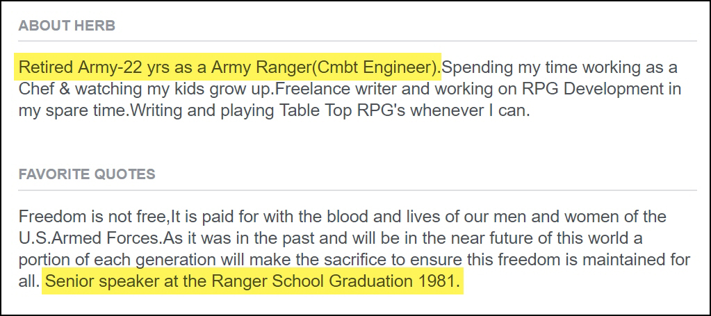 Aw man you just can’t make this shit up. Not to mention during the timeframe he was active duty (before undoubtedly melting a urinalysis cup) 670-1 did not allow wearing the Triple Tower of Power. But seeing as how old Herby Luv Bug here just took a trip to Ranger Joes for an assortment of toy badges I guess it’s ok to dress up while playing tour of booty.