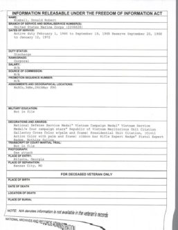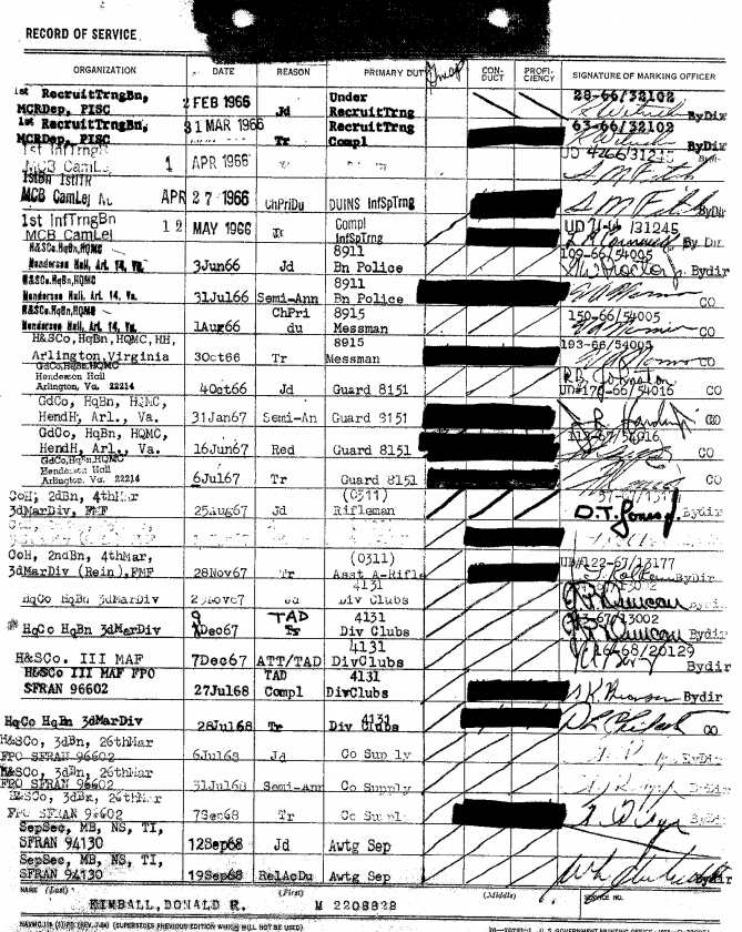 According to his official records he was NOT a RECON Marine. He spent 3 months as an 0311 basic grunt from late Aug of 67 until Nov of 67. He then spent the rest of his time working at the E-Club or in Supply. It seems his conduct while on Barracks Duty in Arlington was piss poor so they sent his ass to NAM. For what ever reason the Corps thought it would be best if he didn’t play with guns and sent him to the E-Club to probably mop floors and pick up beer cans. I can find nothing about his claims of daring-do.