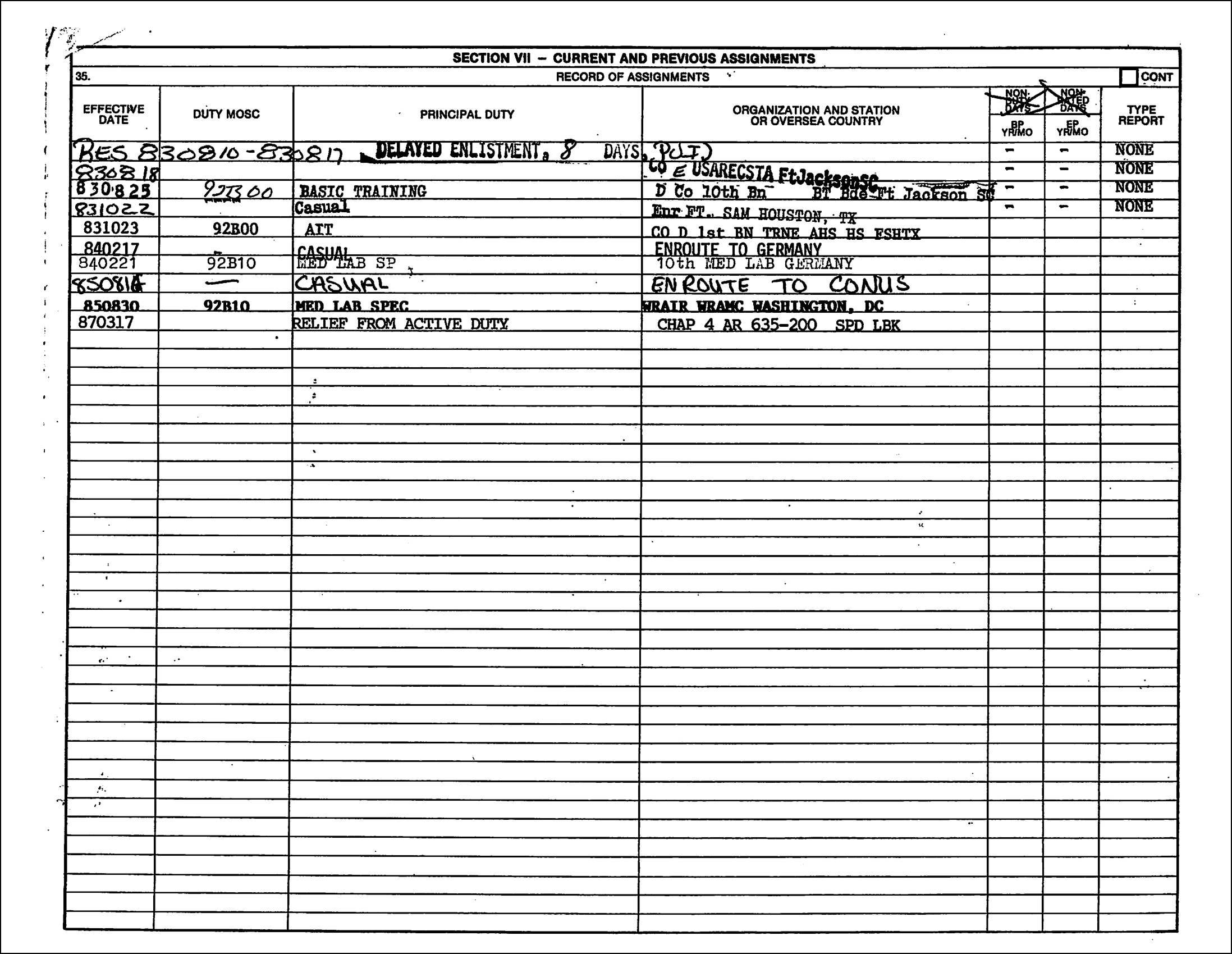 In his four (4) years of service as a Specialist E-4 92B10 Lab Technician, he looks like he specialized in stool sampling as opposed to stool samples.