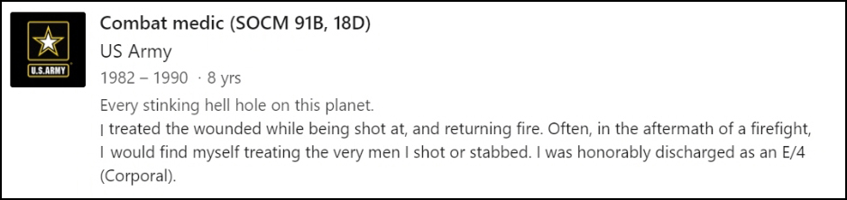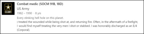 He claims he was a 91B, 18D and 01H but his military records say different…