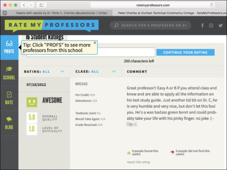He shows up under the Biology Department at Durham Tech on the ratemyteachers.com site. But he doesn’t seem to show up as an employee on Durham Tech’s alphabetical list of employees.
