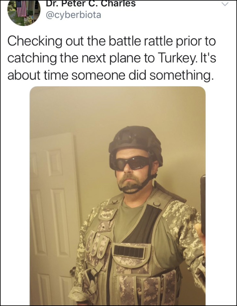 What a joke. His “battle rattle” looks like it just came out of the plastic bag it was shipped in by Sportsmen’s Guide or Cheaper than Dirt. It is obvious a mag was never in any mag compartment on that vest anywhere but maybe in the imaginary combat action this douche conjured up in his fevered proggy brain.