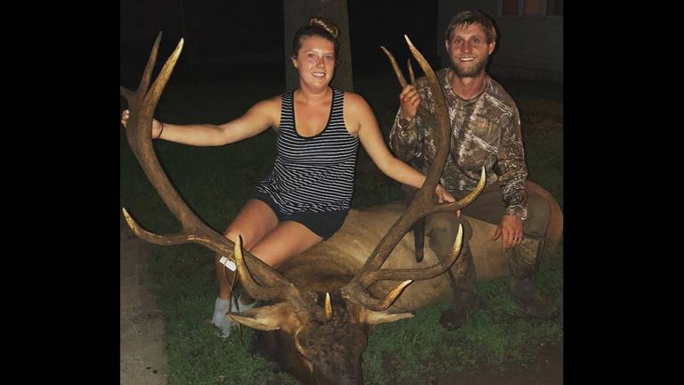 DJ Klenklen, 28, left, and his 23-year-old brother Kody pose with the bull elk DJ shot with a muzzleloader on Sept. 6 in Jefferson County. The bull will not be officially scored until Nov. 5, after the skull and antlers dry, but game wardens said they think it could be a Kansas record non-typical bull elk. Lacy Klenklen Courtesy