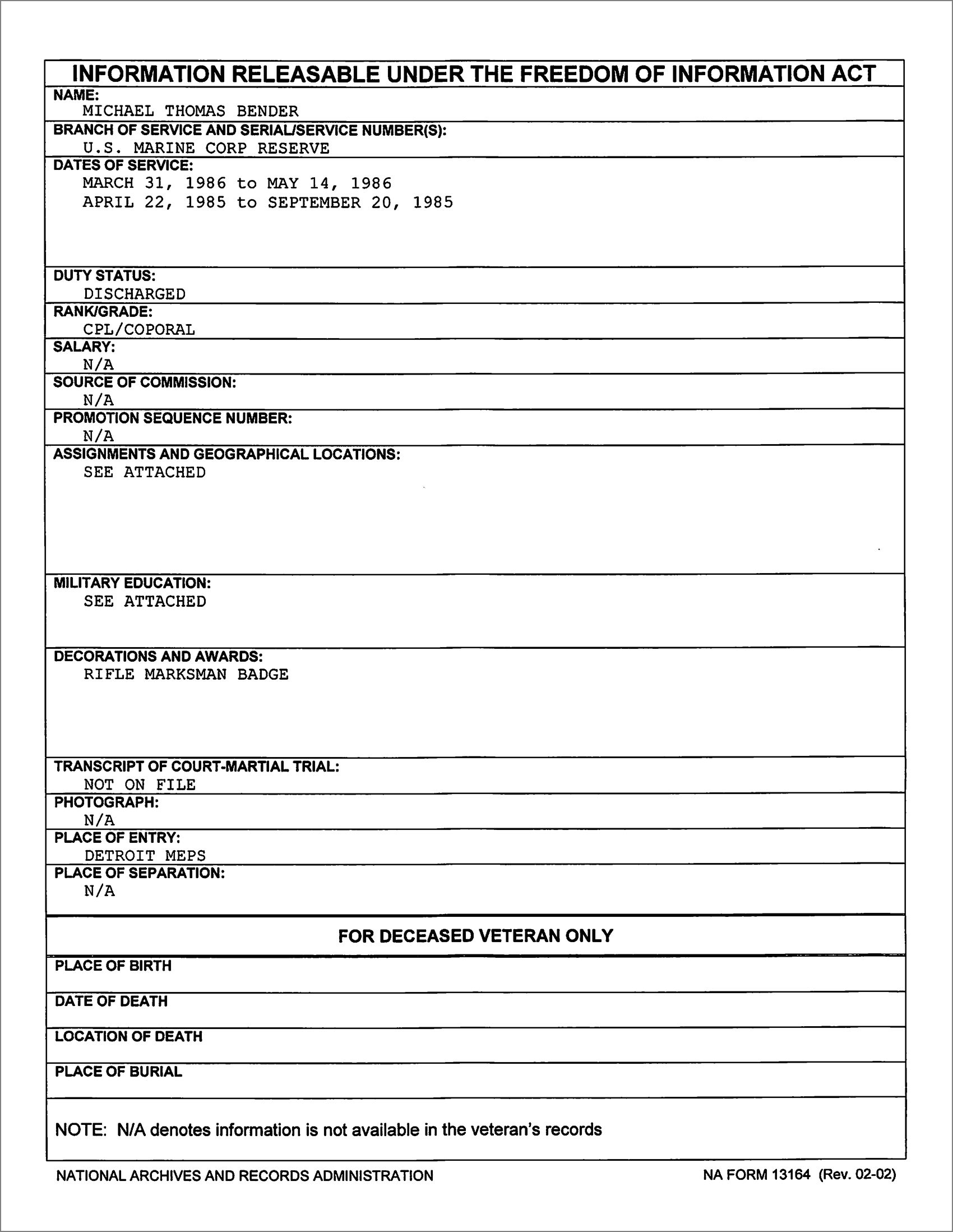 Michael Bender was discharged from the USMC as a Corporal (E-4) vs. a MSgt (E-8).
