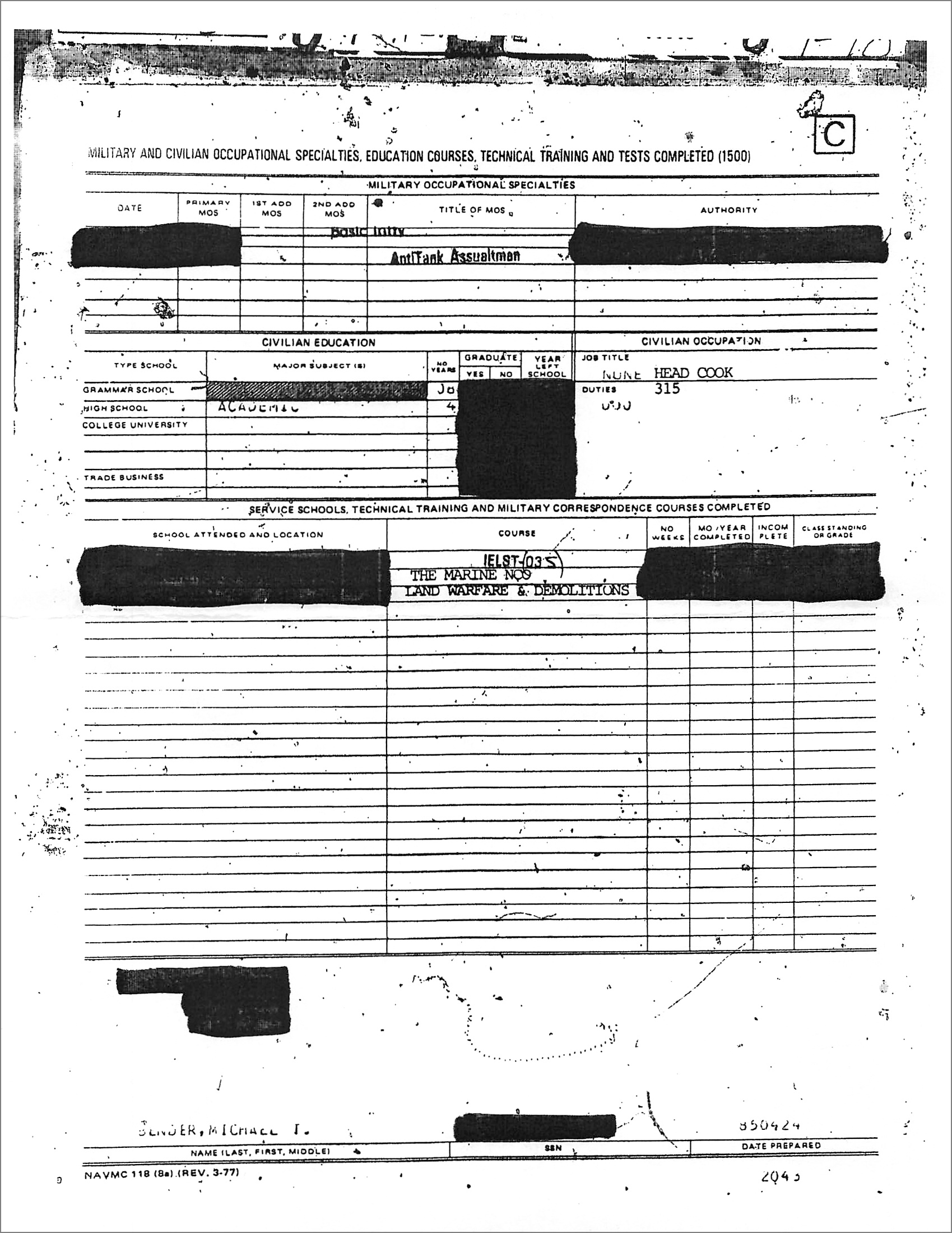 Michael Bender listed “Head Cook” as his civilian occupation, is that code for “Head Job”?