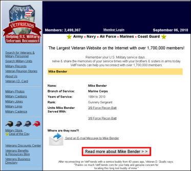 Military Phony sent us their work on Michael Thomas Bender – who claims he is a retired MSgt of Marines who served from 1984 – 2010 and retired after 26 years.