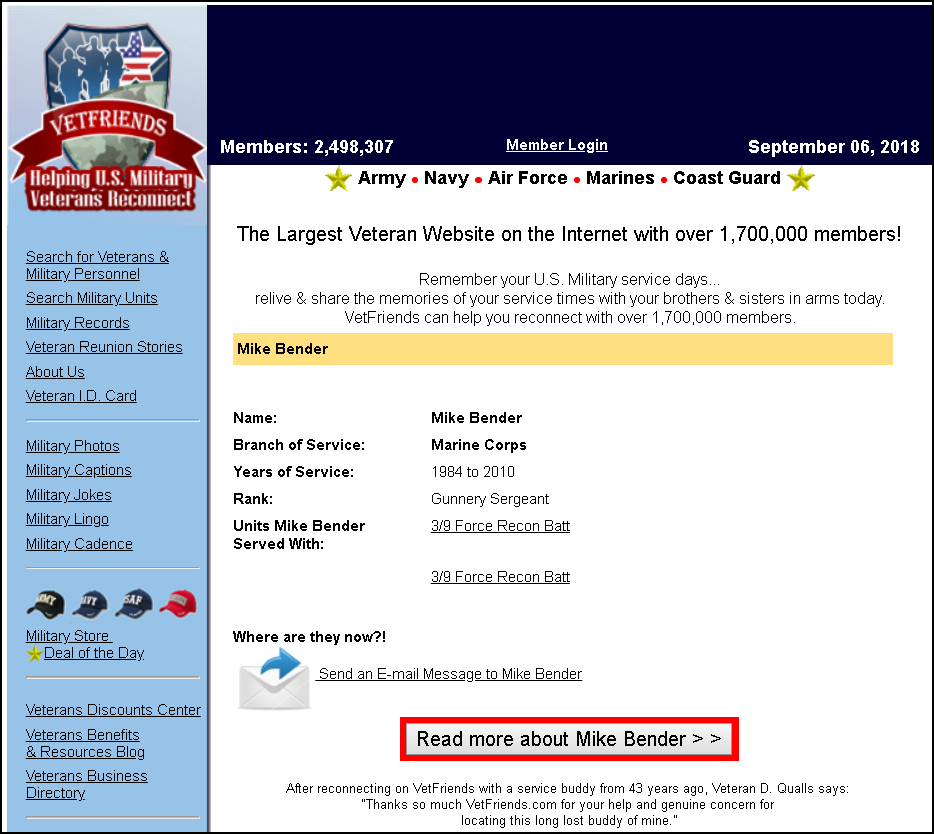 Then, he also claims he was in “3/9 Force Recon Battalion” which must be a super secret unit because nobody has ever heard of it. Also, he claims GySgt vs. MSgt in his VetFriends profile.