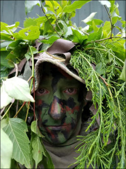 Why is he wearing all that greenery? Was there a sale at the lawn & garden shop? Or is he planning a snipe hunt?
