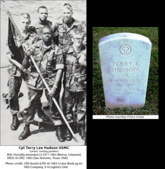 The number 241 is significant to many veterans and family next-of-kin for the servicemen killed in Beirut Lebanon on Sunday October 23, 1983. Although there were over 270 men killed in action in Beirut from 1982-1984, most were lost on Oct 23rd. Many are reminded when they see the clock display this number, or see it on a locker, parking space, or other items we encounter in everyday life. I want to remind people of Terry Hudson, who was a Marine that was in the Marine Barracks that morning. Terry was an armorer, so he oversaw a lot of the weapons and ammunition used by the troops. Being an armorer meant that just about everyone knew you. As a result of the bombing, Terry Hudson had over 43 percent of his body burned from the waist up. He had severe inhalation wounds. Three of his fingers had been completely burned off. Terry was transferred to a burn unit in San Antonio Texas and this happened to be close to his family in Alabama. He suffered four heart attacks during his recovery but eventually succumbed to his wounds six weeks later and died on December 5, 1983. Of the men that never left the hospital, he was the last serviceman to die from the Beirut Bombing, and many would say #241. There was a Marine that died a few days before Hudson on December 2, 1983 but his death was announced after Hudson’s, which brought the death toll to 241. Terry’s mother was a divorced single parent struggling to raise 13 children and her lifelong dream was to buy a permanent home. One of Terry Hudson’s last wishes was that he told his sister “Look for a house for Mama” and died before he could see that dream realized. Mrs. Hudson did buy the small home with the SGLI insurance money from Hudson’s death. I only ask that you think of Terry Hudson and the 240 other Marines, sailors and soldiers that died that day. Perhaps others will also remember them everytime they see the number 241 in everyday life.