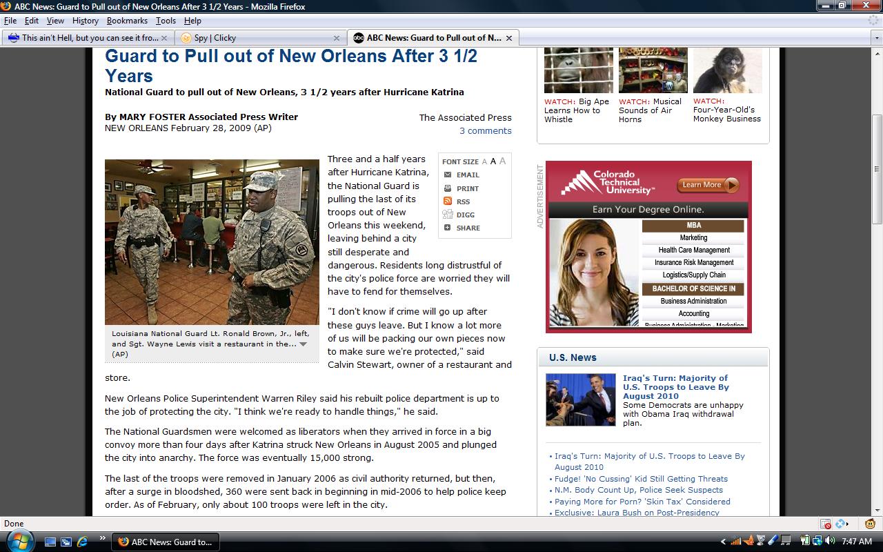 Apparently, US troops are finally being pulled out of New Orleans and the residents of that city are worried that they’ll be left unprotected. First the screen capture;