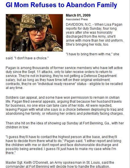 Those damn “they” lied again. But since she enlisted, all of this hoopla about IRR call ups happening should have spurred her into action, especially since it’s been over a year since she was notified to be recalled. Did the Army do a dumb thing? Yes, they did, since they’ve had a few chances to shed themselves of this particular problem and didn’t. But that doesn’t justify Pagan contacting the Associated Press to battle this out in a public forum.