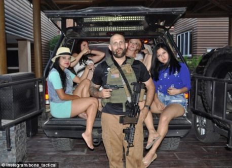 I see he’s wearing some kind of vest while holding a pistol and a rifle in front of an SUV full of bimbos, is he going for the Tactical Pimp look?