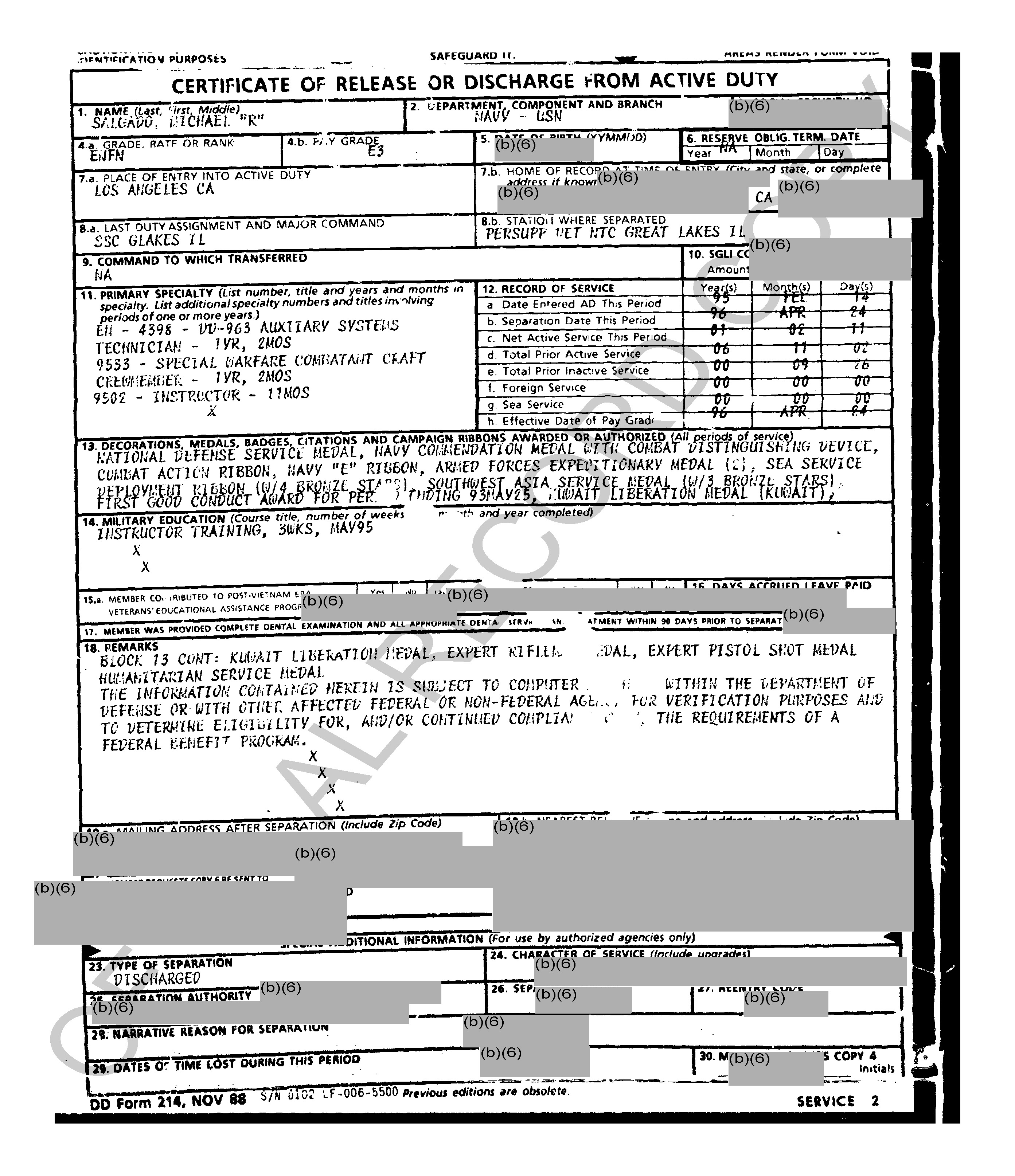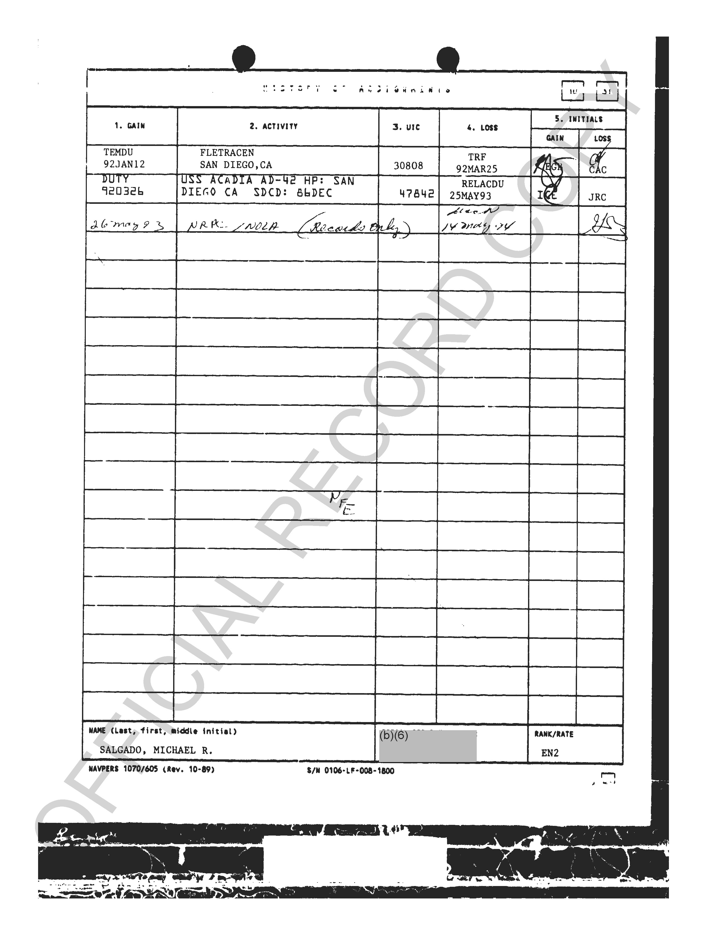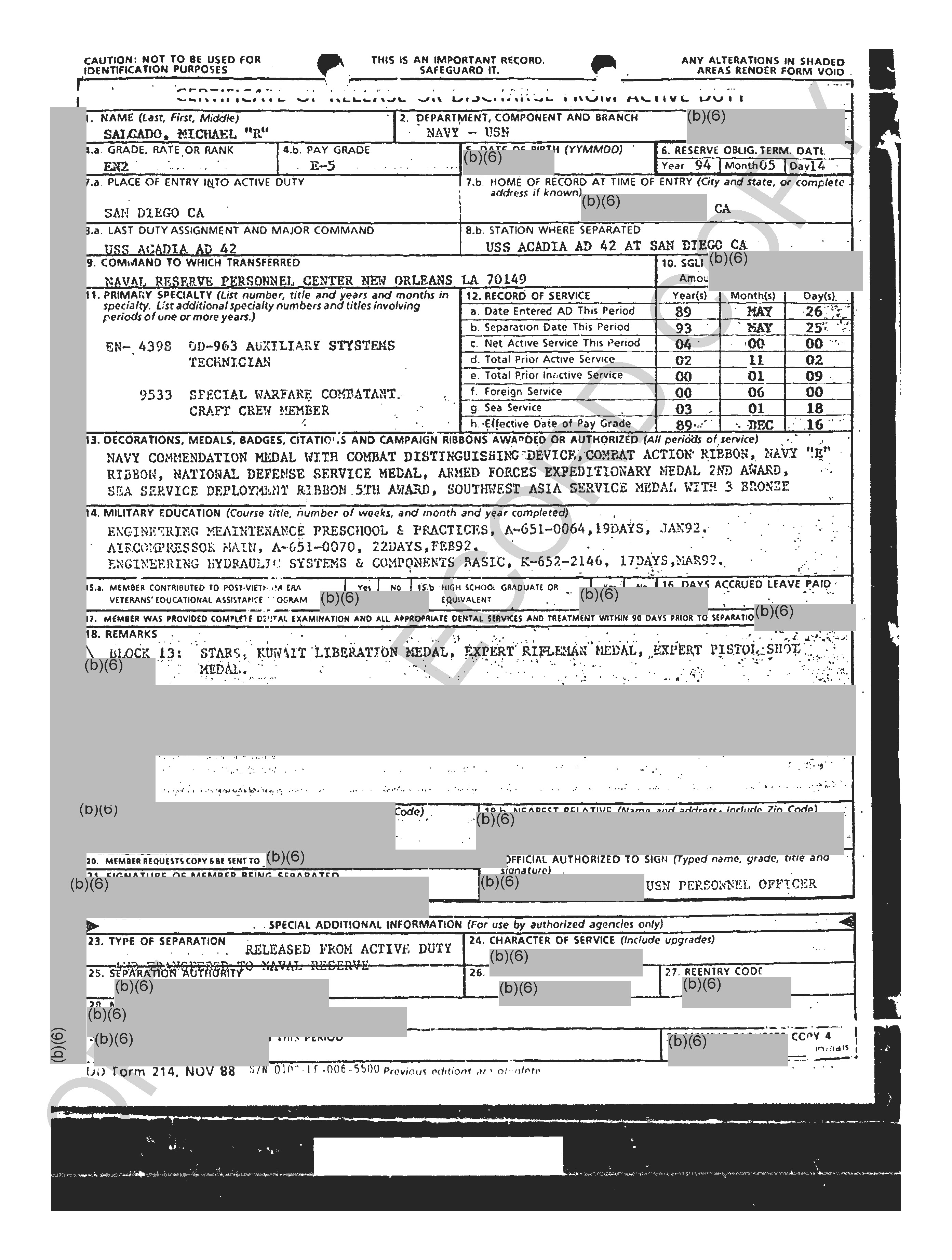 He got out as an EN2 in ’93 and came back in ’95… probably as an E-4 since he had been out for a while. Got hammered at Captain’s Mast and was given the boot at SSC Great Lakes.