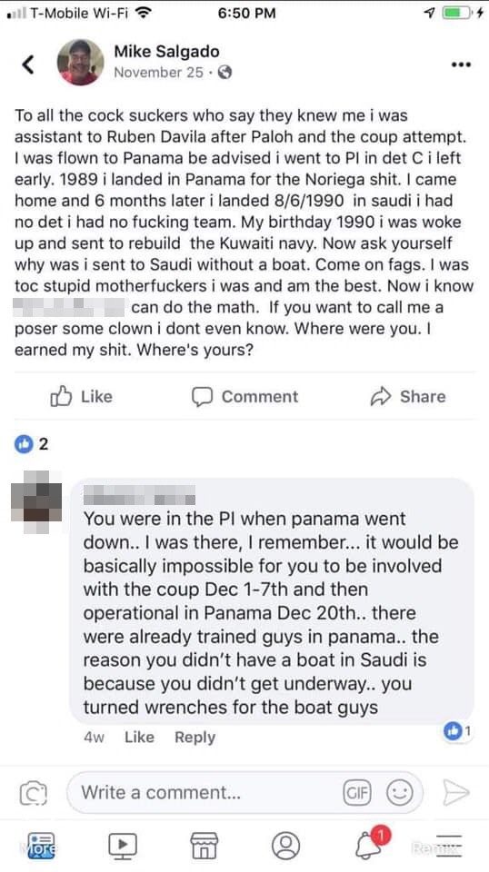 I know for a fact that he didn’t land in Saudi on 6 Aug 1990, because I was on that flight. Other than those SEALS who were serving on the SOCCENT staff, there were only about a half-dozen of us SEALs on that aircraft, and if I take the time to think back, I could name all of them. This dick-head Salgado wasn’t one of them.