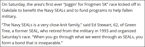 For some reason, people around Ed believe he was a Navy SEAL. He participates in many community events and is introduced as such. Below, Ed is being introduced as the annual race director by Joggin’ for Frogmen, an organization that honors the Navy Special Warfare community.