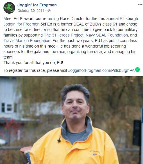 Ummmm TAH, me thinks this is an outdated outing by about four years. In researching the sonovabitch to let the organization and their sponsors know about this post, Jason P. Brahim is listed as the 2018 race director for Pittsburgh, PA. I suspect someone let the Navy Seal Foundation (sponsor of Joggin) know about this phony and they threw him overboard. Regardless, although Military Phonies does a very good job, I send the info to the foundation just to ensure they have it.