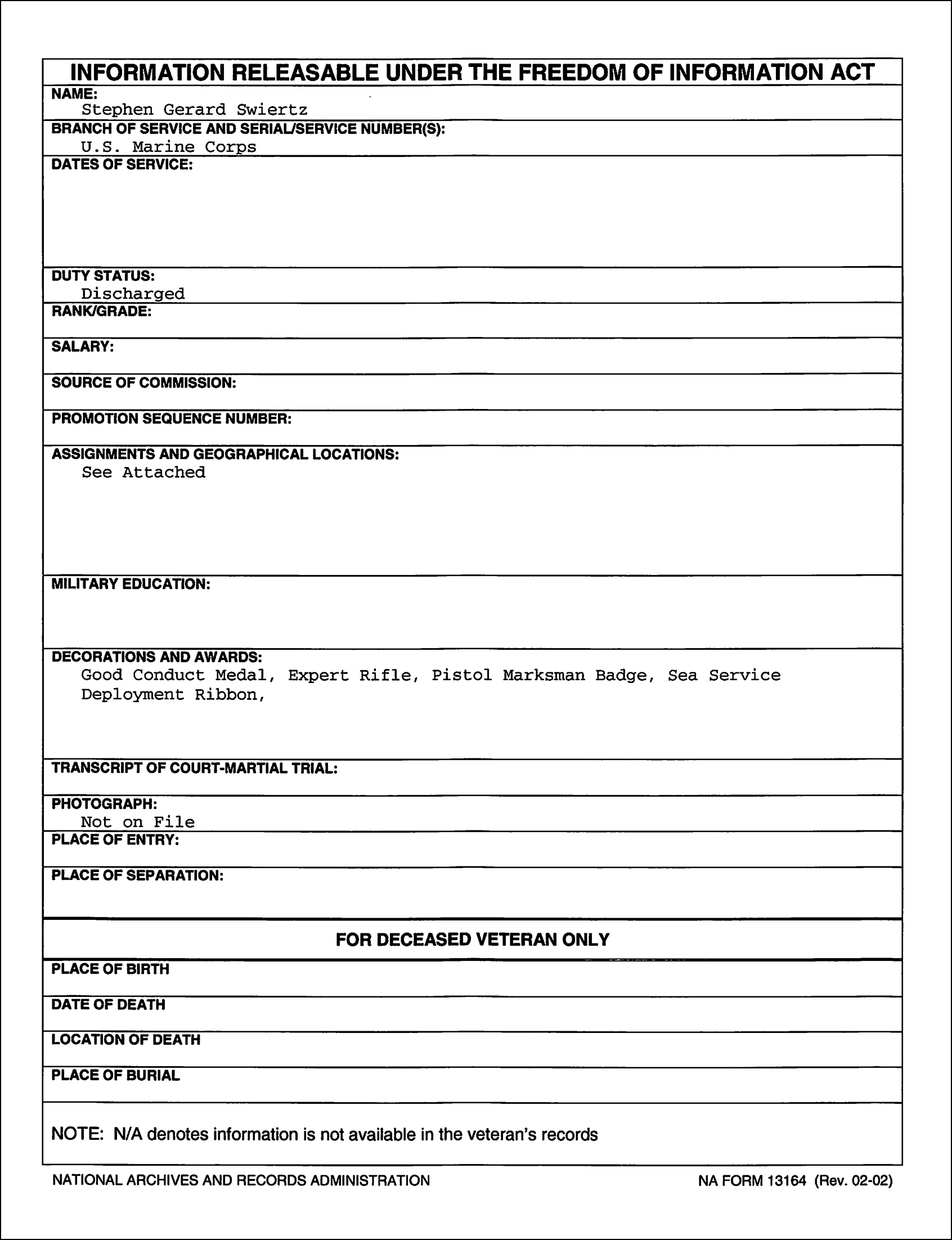 No rank\grade recorded on his DD214. Stephen Swiertz is a super secret squirrel (say it five times really fast).