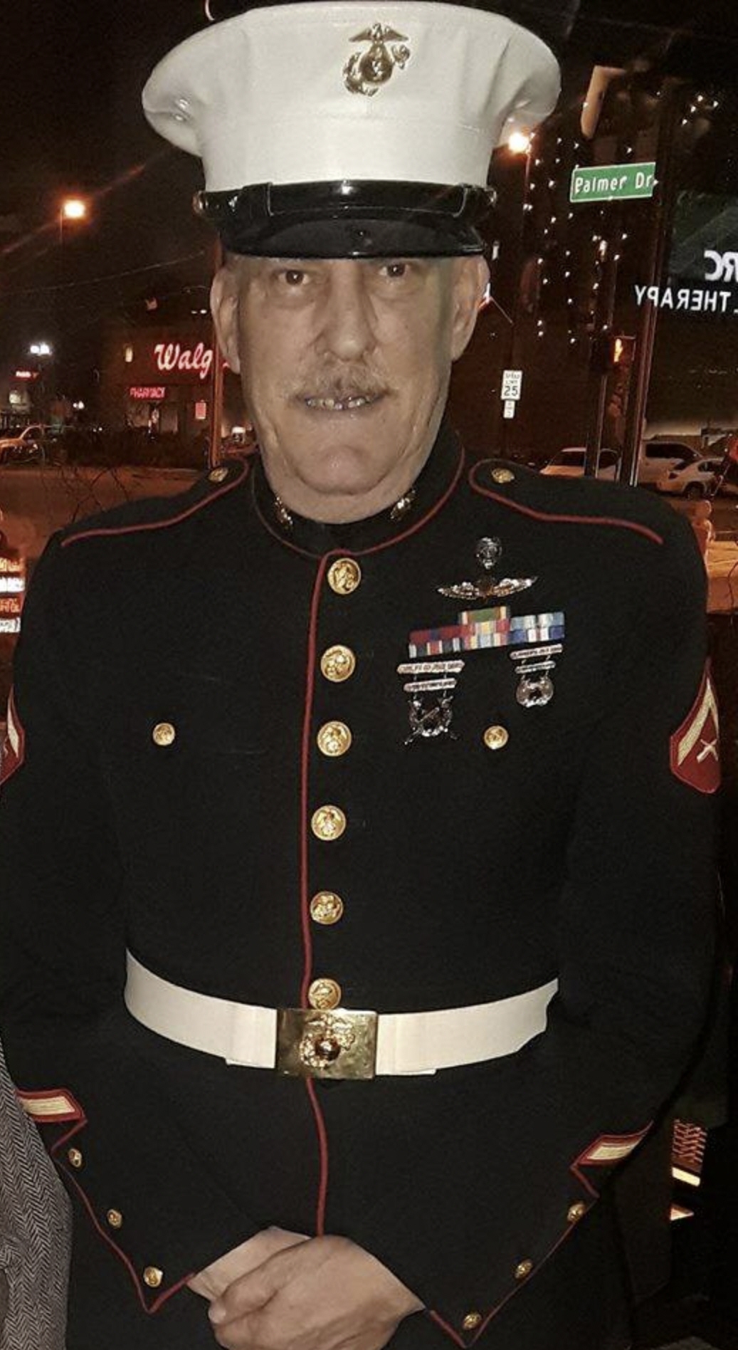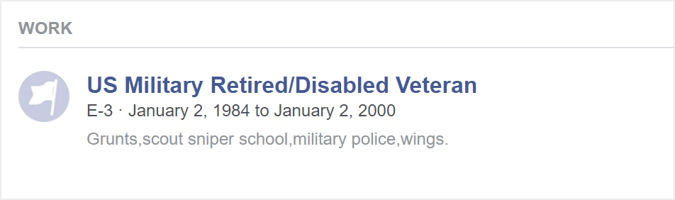 As you can see from the photo of him in uniform, he is displaying a ‘scuba bubble’ and jump wings that are indicative of Marine Recon. That’s only the tip of the iceberg since he also claims military police and scout sniper.