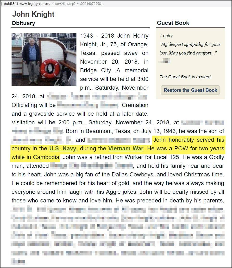Knight died days after this interview, but his obituary reinforced his legacy as a two-year POW in Cambodia.