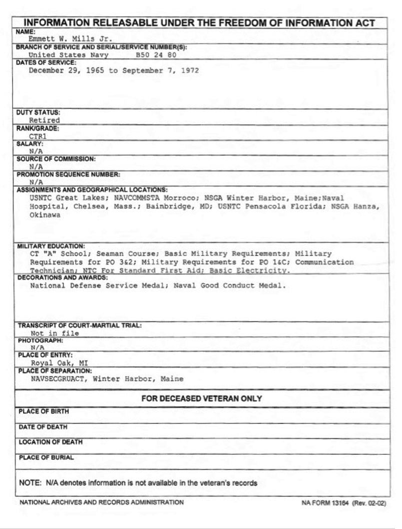 Emmett Mills Jr. retired after serving from Dec 1965 to Sep 1972. He retired at the rate of CTR1 (Cryptologic Technician E-6). His awards and decorations are listed as the National Defense Service Medal and the Naval Good Conduct Medal.