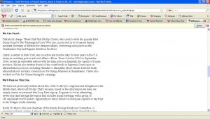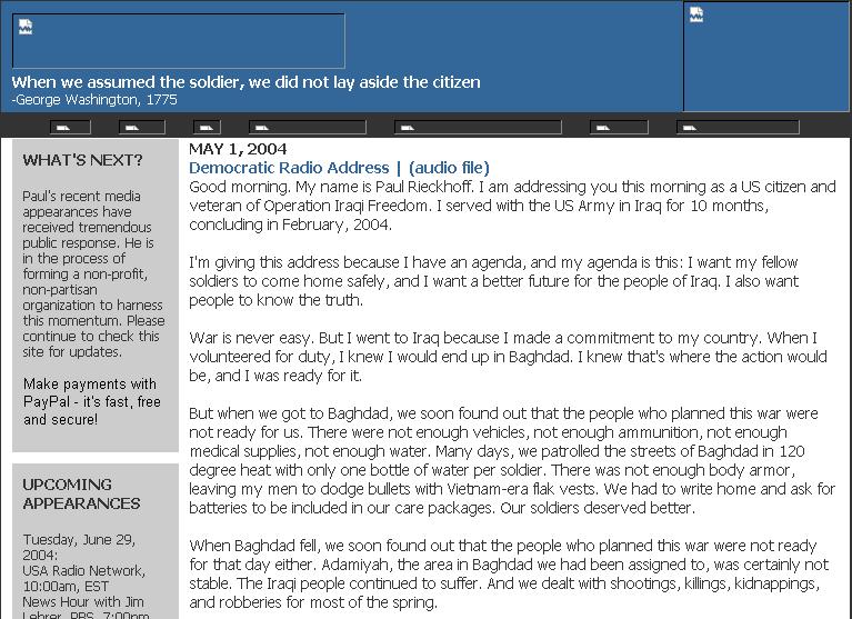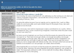 Upon his return to the US, Reickhoff gauged the political climate in the US and determined that his fortunes could best be served by being anti-Bush. Within months, he approached the Kerry campaign and offered them a unique opportunity to have an Iraq veteran criticize the president on the airwaves in the form of a rebuttal following Bush’s weekly presidential radio address. Here’s a partial copy of it from a cached copy of Reickhoff’s old website OpTruth.org;