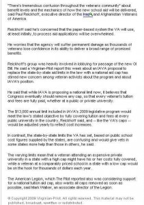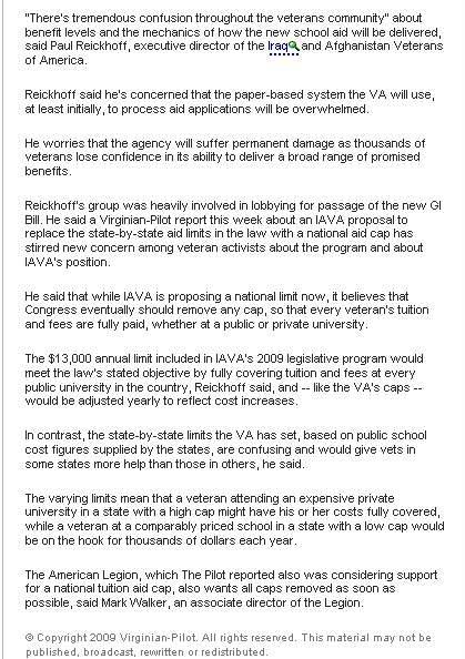 Since our email exchange, Reickhoff did an interview with the Virginian Pilot in which he claims that IAVA’s current position on the Post-9-11 GI Bill for veterans is that they support spending caps. What kind of veteran organization would support spending caps? Well, since that’s the way that the Obama Administration is going with their policy towards veterans, I can only guess that a partisan veteran organization would support caps on veteran benefits. Especially since IAVA put such a high value on the new GI Bill that their Senate scorecard relied heavily on how Senators supported that GI Bill. Suddenly, gob smacked by reality, they support spending caps on it.
