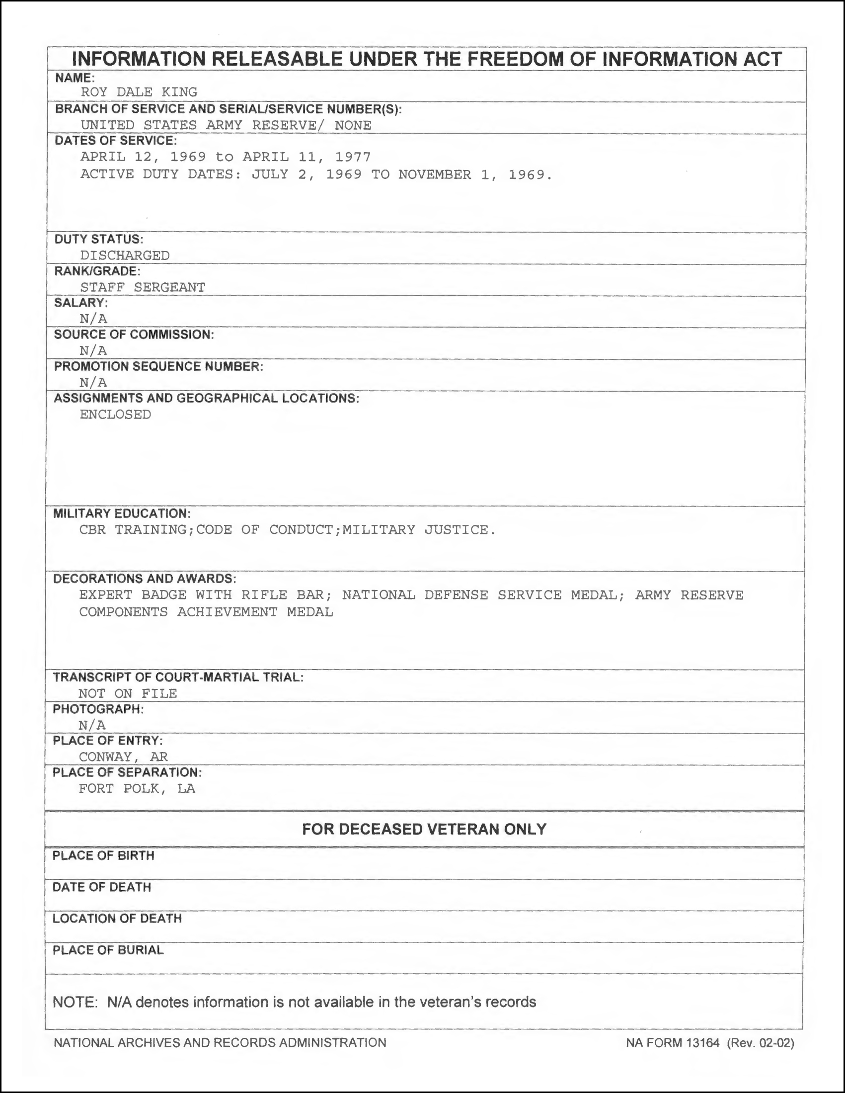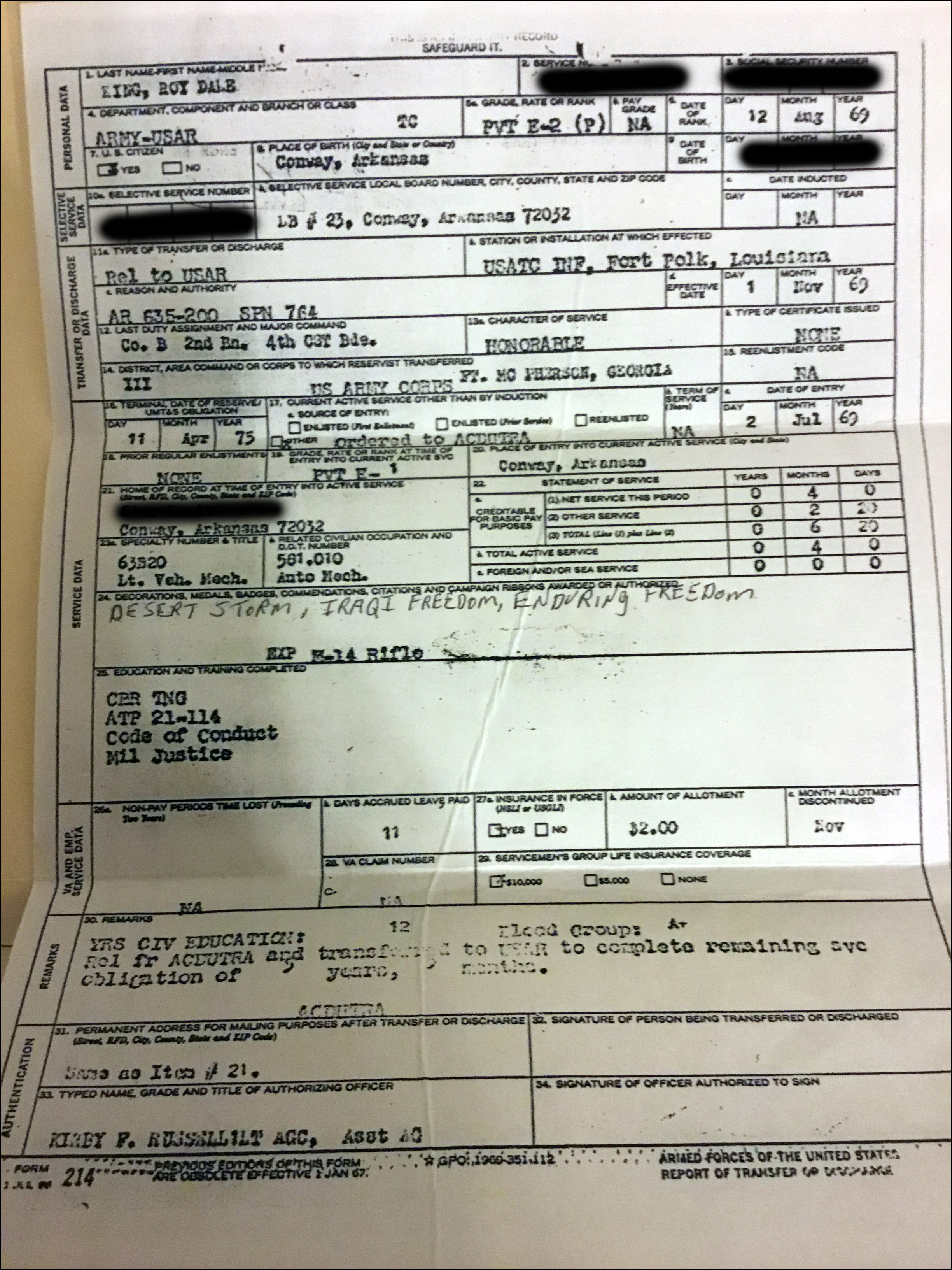 So, according to the official military records, King was a vehicle mechanic and stayed in the Army Reserve from 1969 – 1977, with only his initial four (4) months being active duty. It appears that the initial four months was for Basic Training and AIT, then he was released back to his reserve unit.