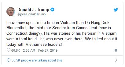 Read more about it here: https://www.foxnews.com/politics/trump-blasts-da-nang-dick-blumenthal-ahead-of-hanoi-summit-with-kim-jong-un