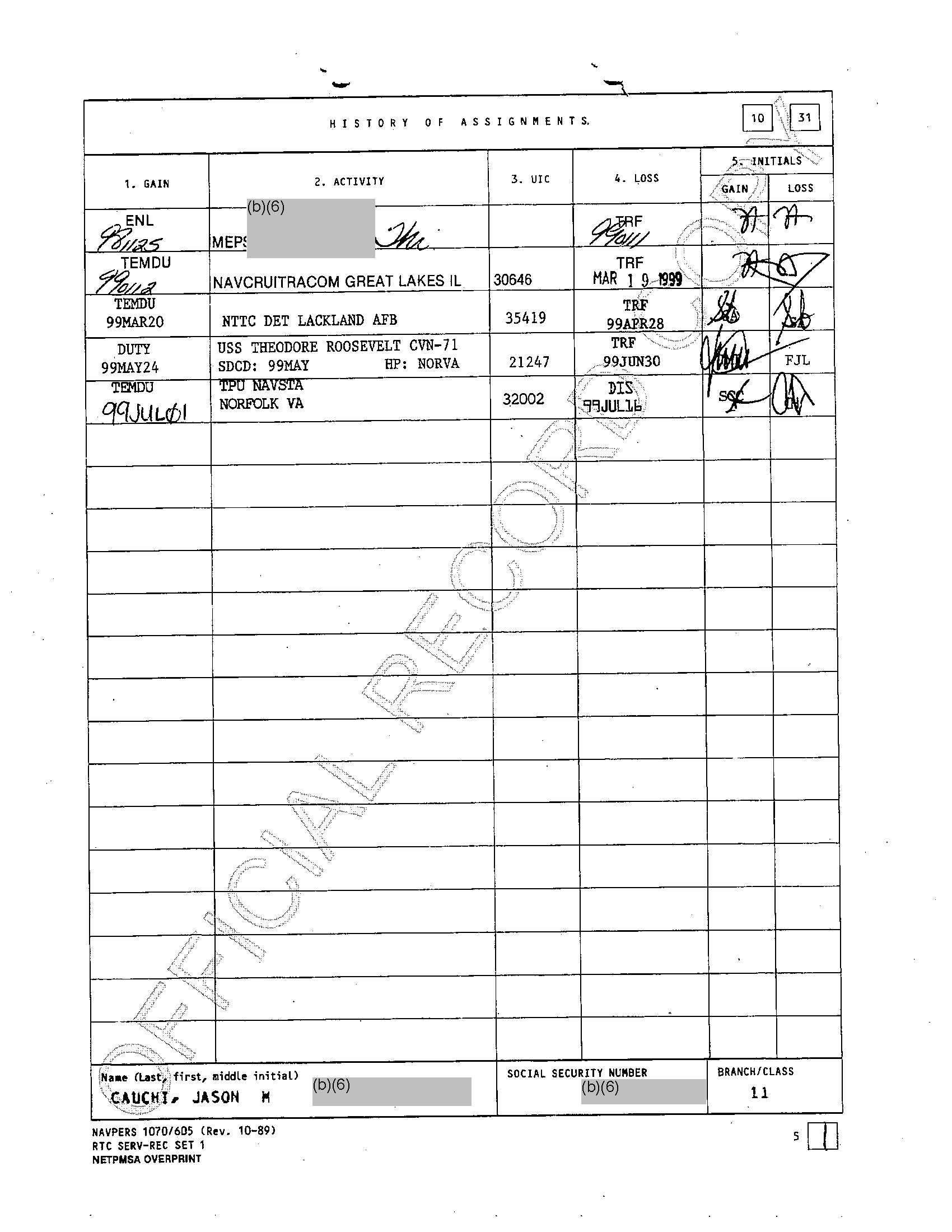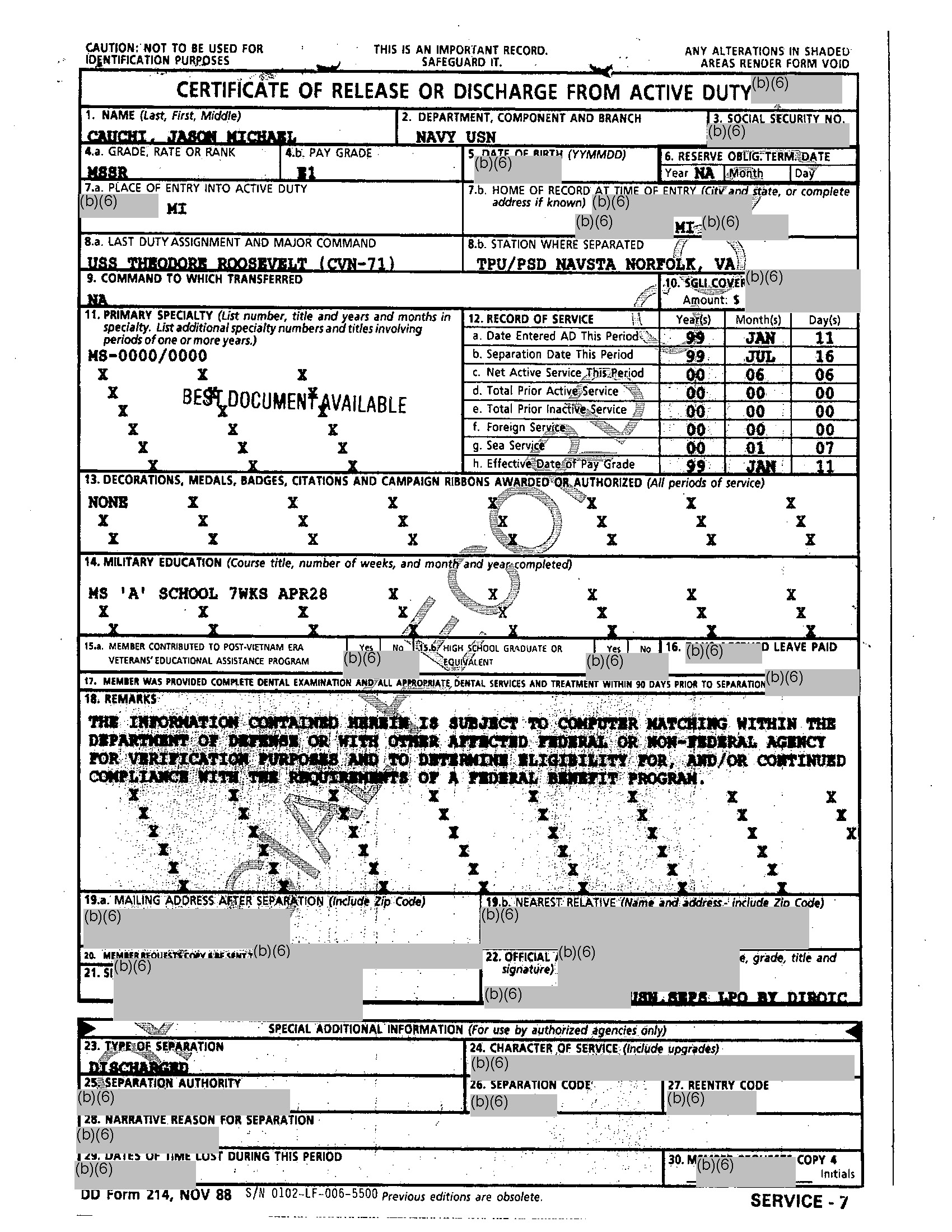 By July 1, 1999 he’s back in Norfolk, VA for out processing, with a discharge July 16, 1999.