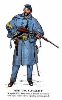 His enlistment noted that he was 21 years old, 5’5” tall, and described as having a dark complexion, common for those working outdoors. Pay back then for privates was a stately $13 a month. He was first posted with the 1st US Mounted Rifles in the American Southwest. Largely made up Irish and German soldiers, the 1st Mounted Rifles later became the 3rd US Cavalry. He served five years before mustering out, still a private, in the New Mexico Territory in 1860.