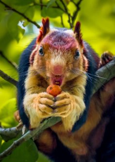 The above photo is that of a Malabar giant squirrel. This is its real coloring, no photo shopping done on my part. The photographer managed to get it at the right angle, and lighting, to highlight its colors. Here is another photo of the colorful squirrel from another angle: